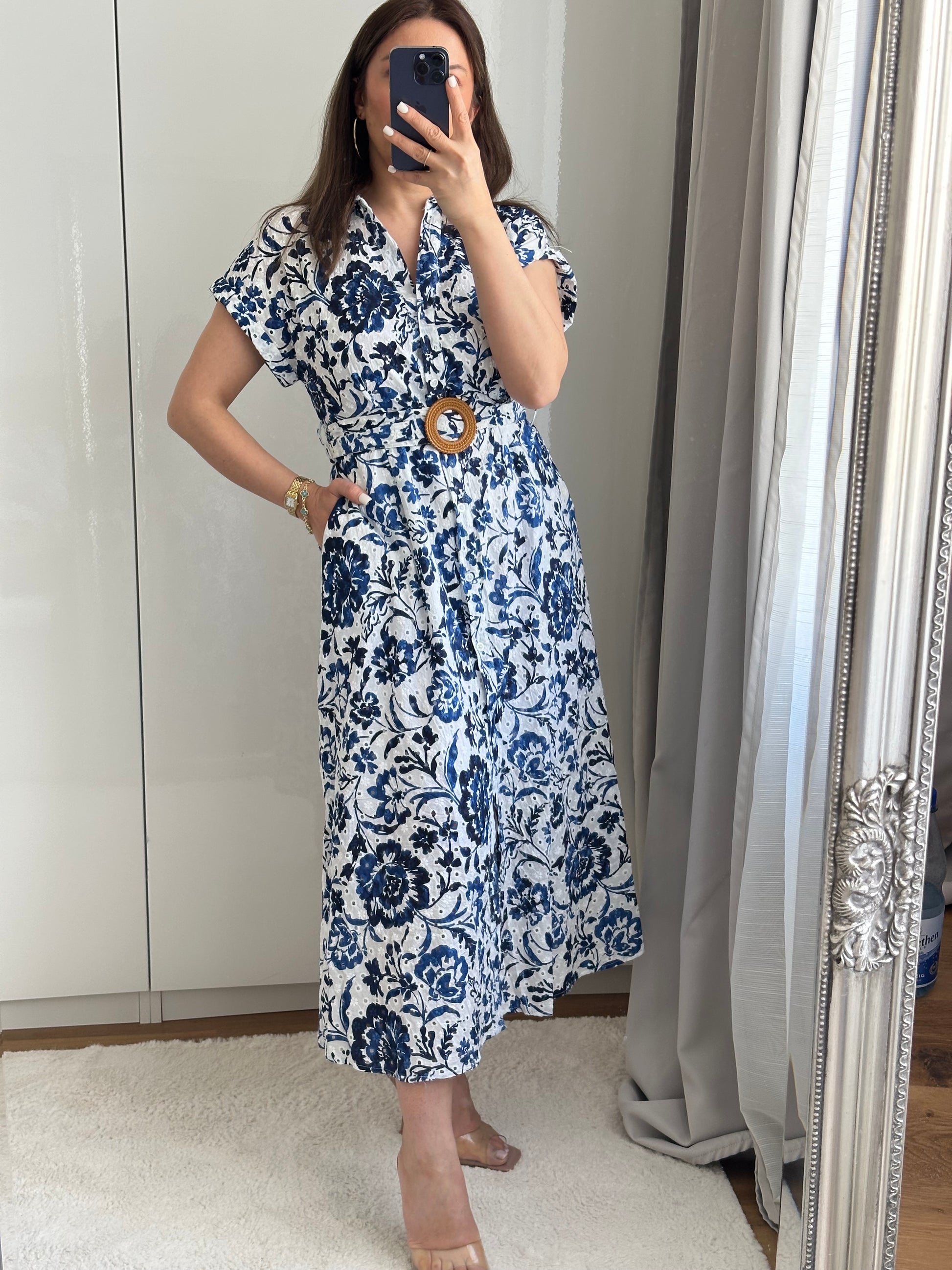 Elegantes und bequemes Sommerkleid mit stilvollem blauen Blumenprint auf weißem Hintergrund.