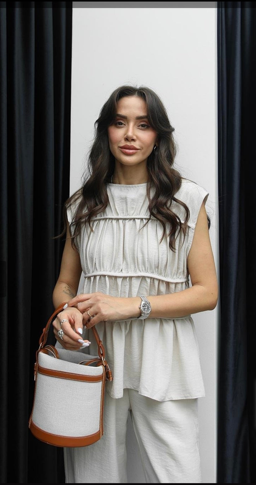 Ein luftiges Set aus angenehm weichem Viskosestoff – bestehend aus einem ärmellosen, locker fallenden Oberteil mit verspielten Raffungen und einer bequemen Hose mit elastischem Bund. Die perfekte Wahl für stilvolle Sommerlooks und maximalen Tragekomfort im Alltag.