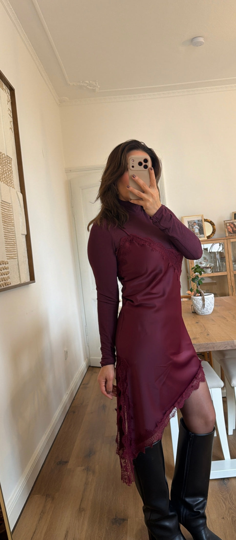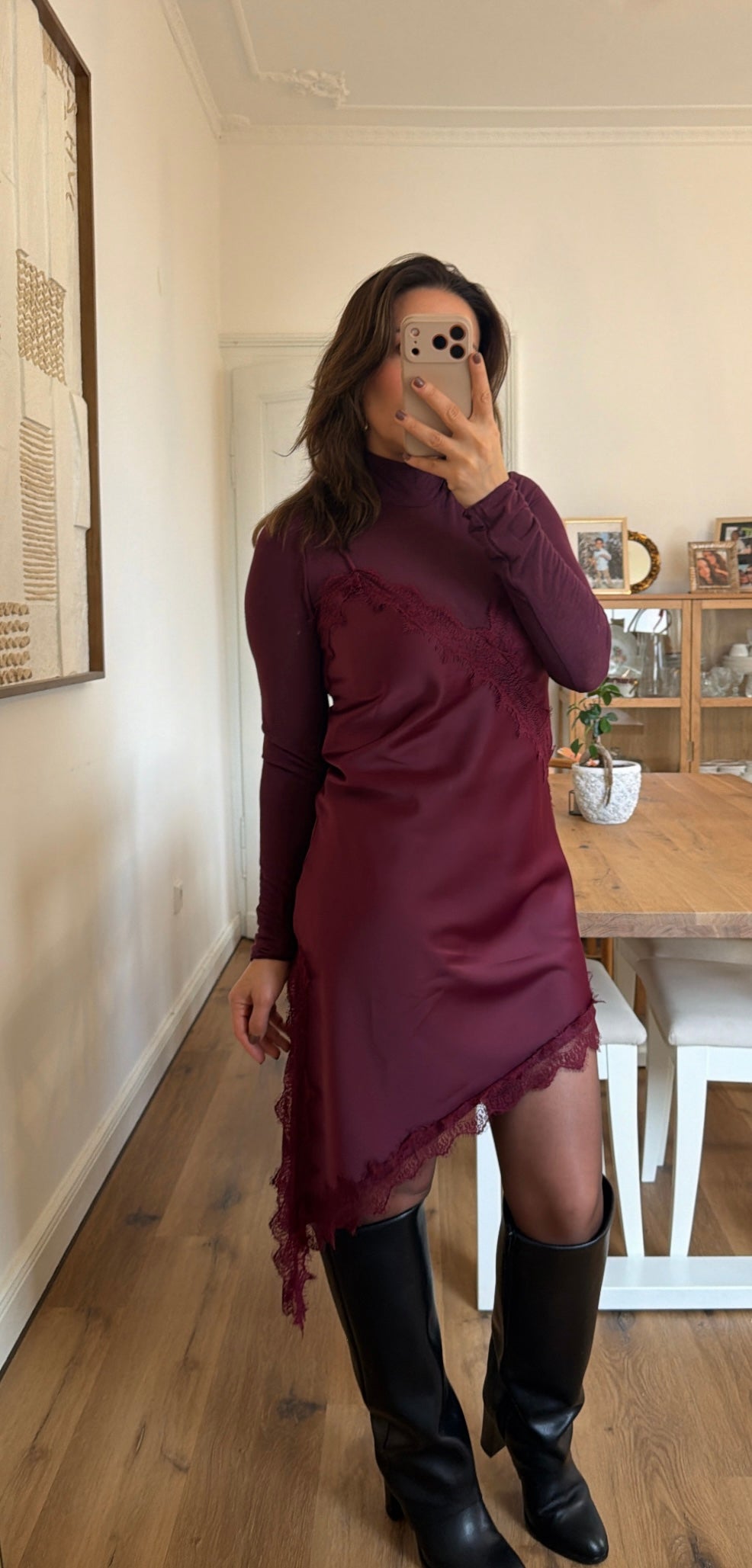 Kleid aus Satinstoff. V-Ausschnitt und feine Träger. Ton-in-Ton-Spitzenapplikation. Asymmetrischer Saum.